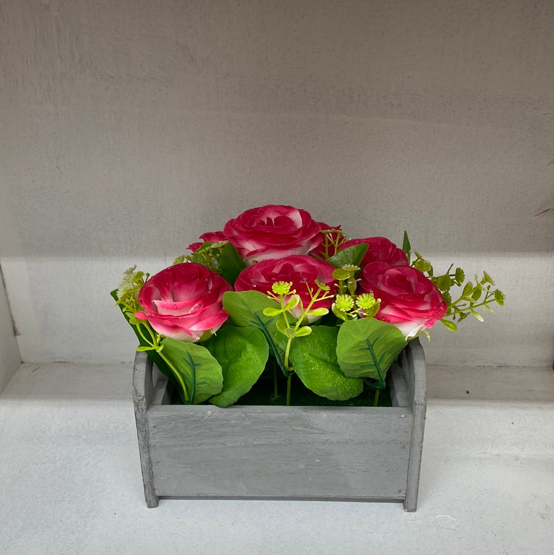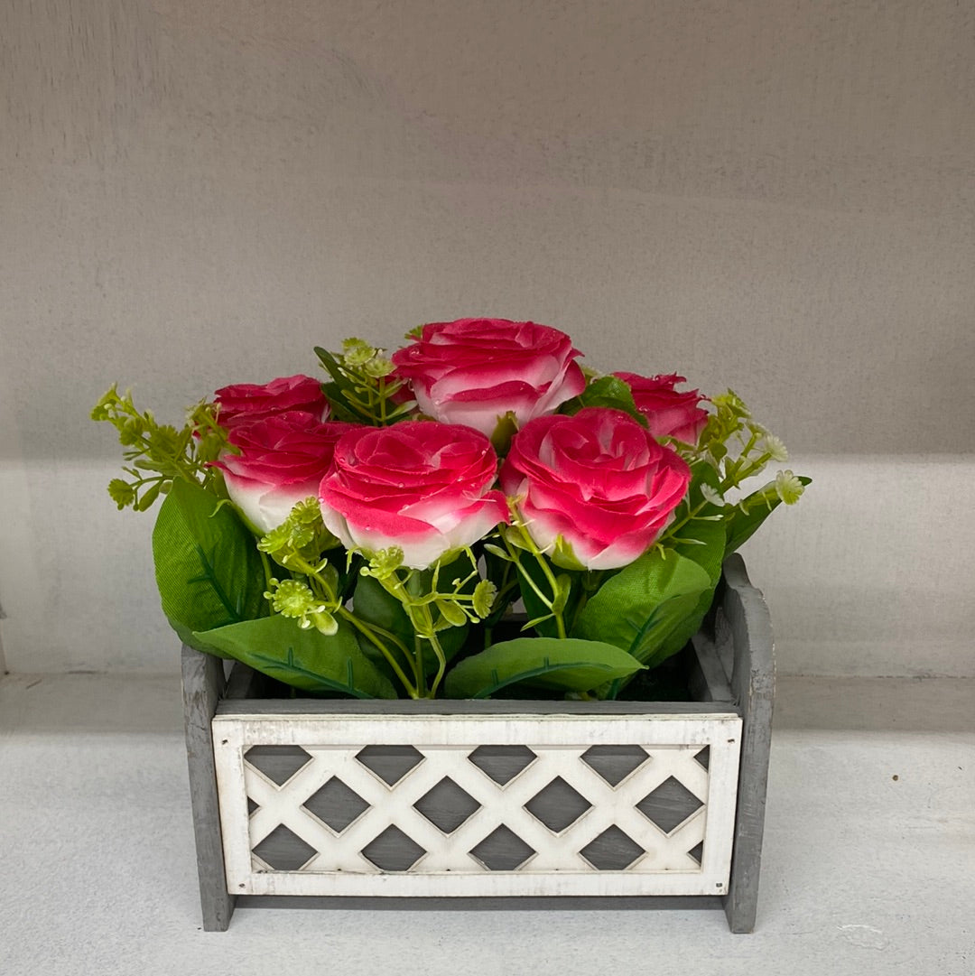 This artificial plastic plant features stunning pink and white roses, complete with water droplets for a realistic touch. The foam filling at the bottom and green vegetation on top add to its lifelike appearance. The gray flowerpot with white fence decoration is made of wood, bringing a touch of warmth to any space.
