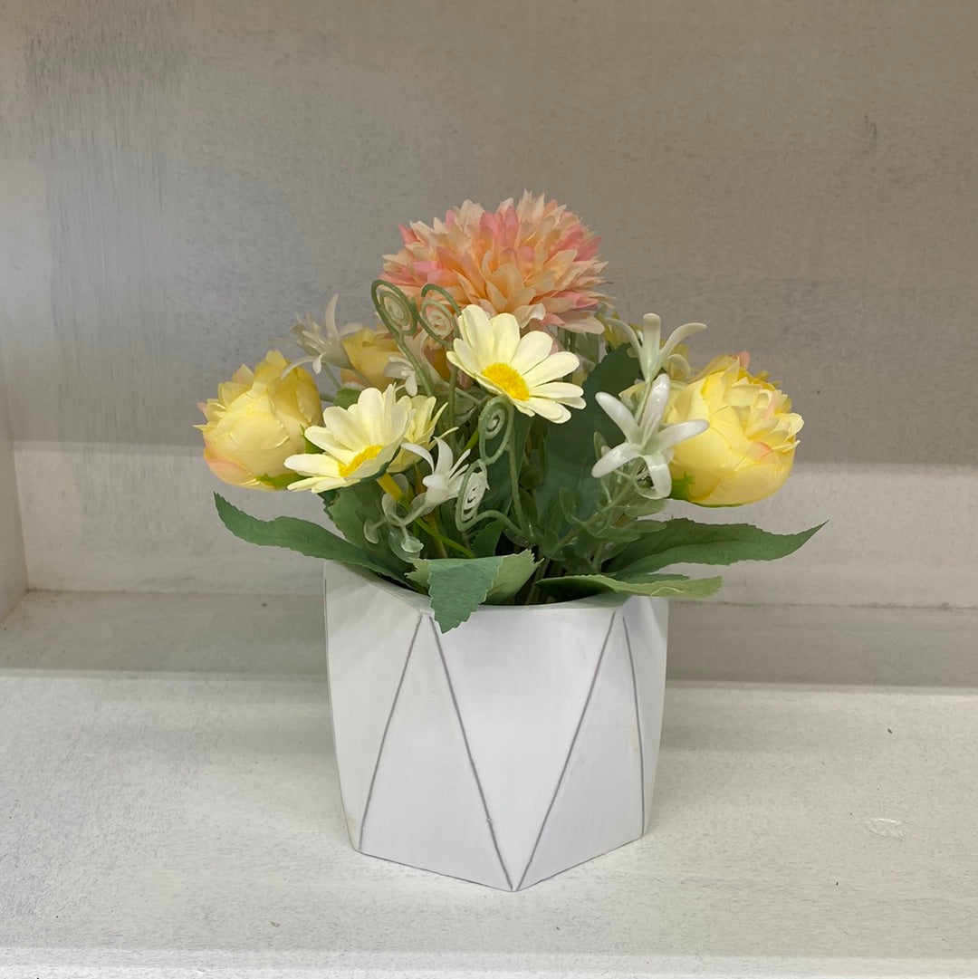 Add some life to your space with these beautiful Artificial Plastic Plants. The yellow flowers, resting in a white diamond shaped pot, provide a pop of color without any maintenance needed. Perfect for those who want the look of real plants without the hassle.